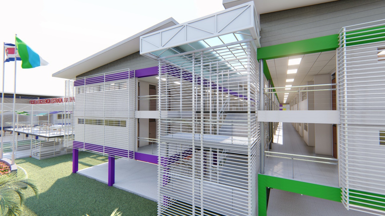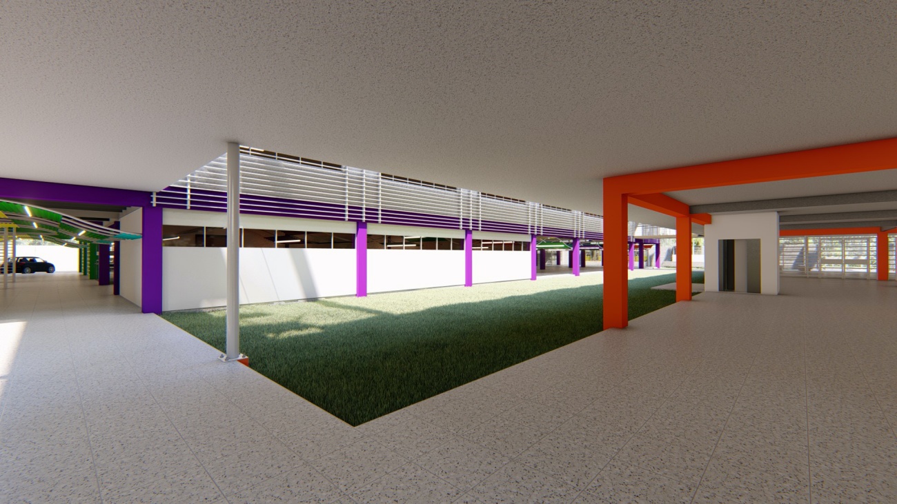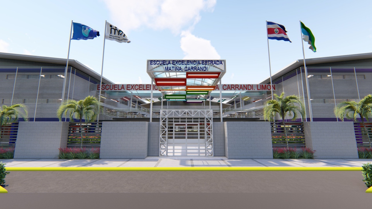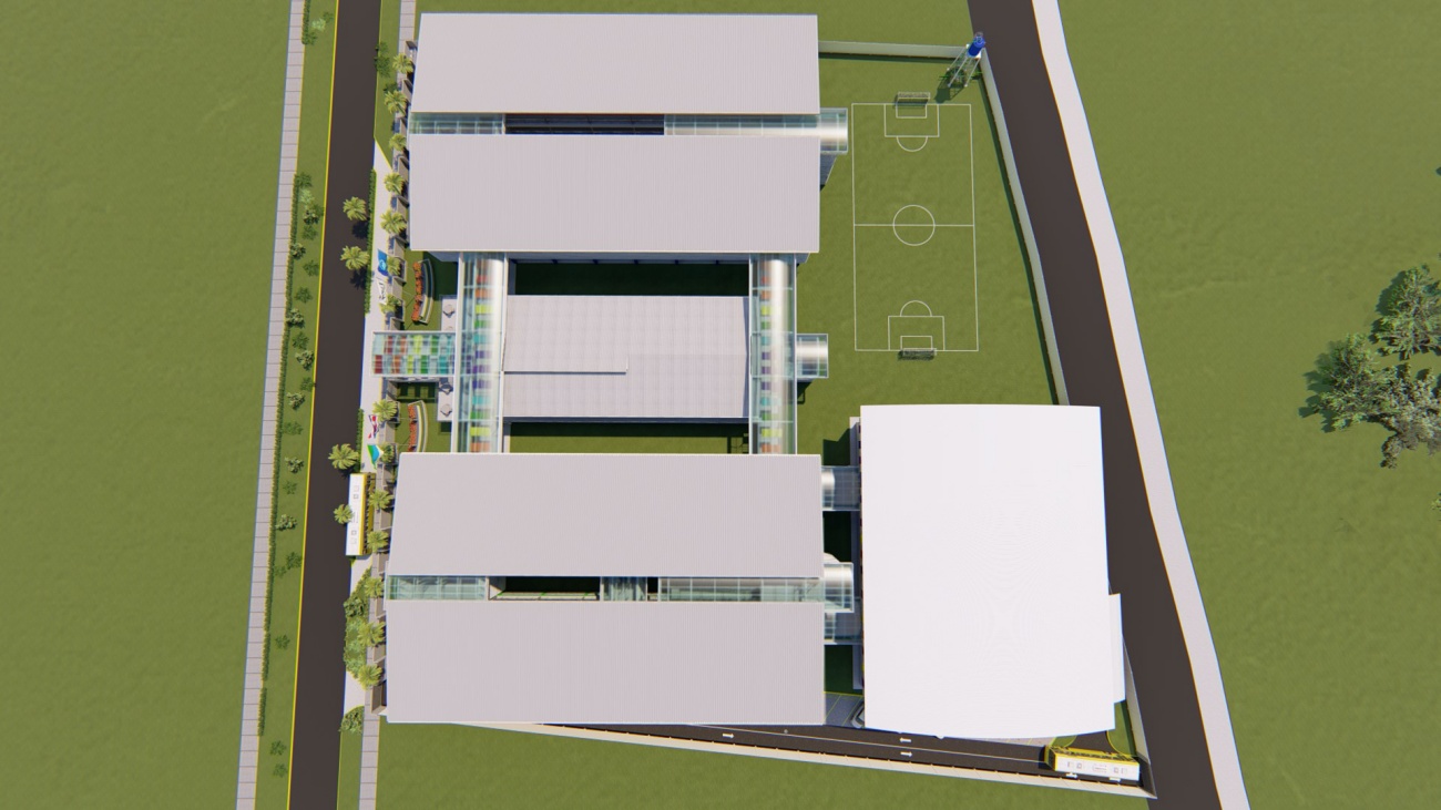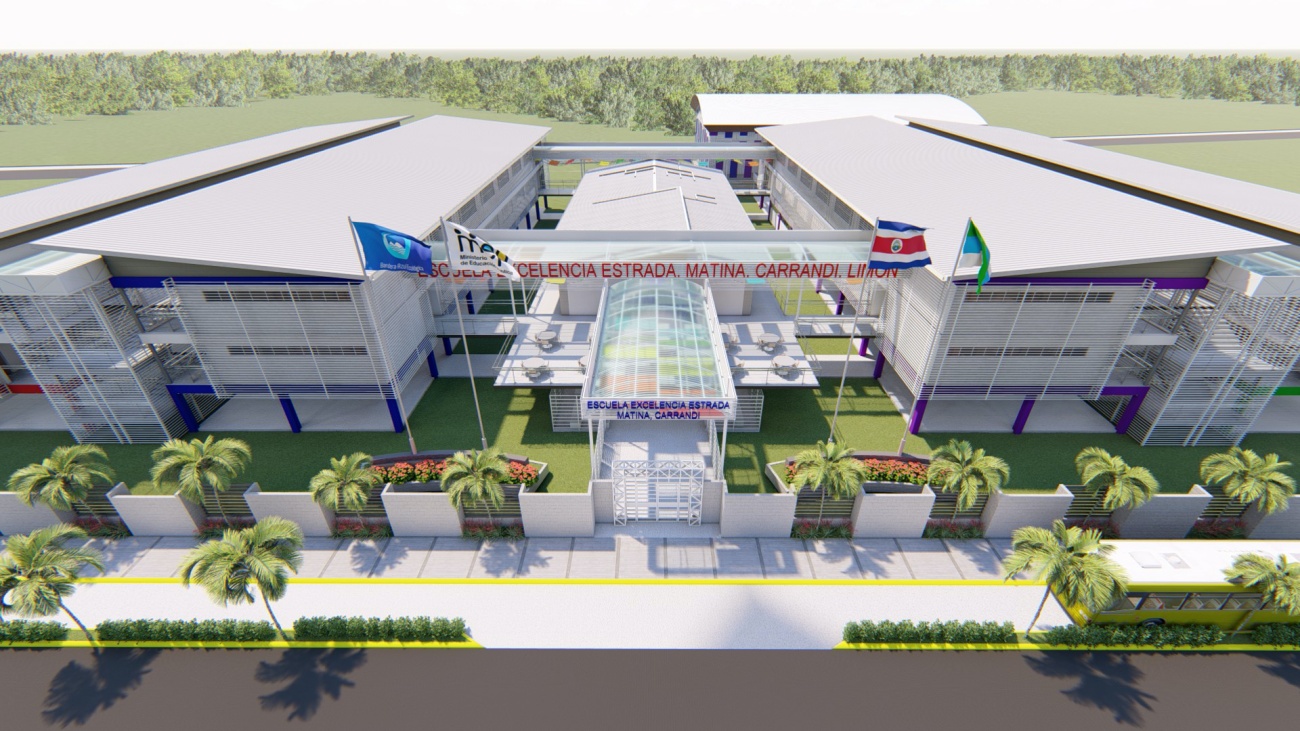 Construcción escuela nueva de 48 aulas de 72m2, con comedor para 120 estudiantes, gimnasio de 1200 m2 y cancha de fútbol con medidas reglamentarias, con parqueos para 12 vehículos y 2 autobuses.