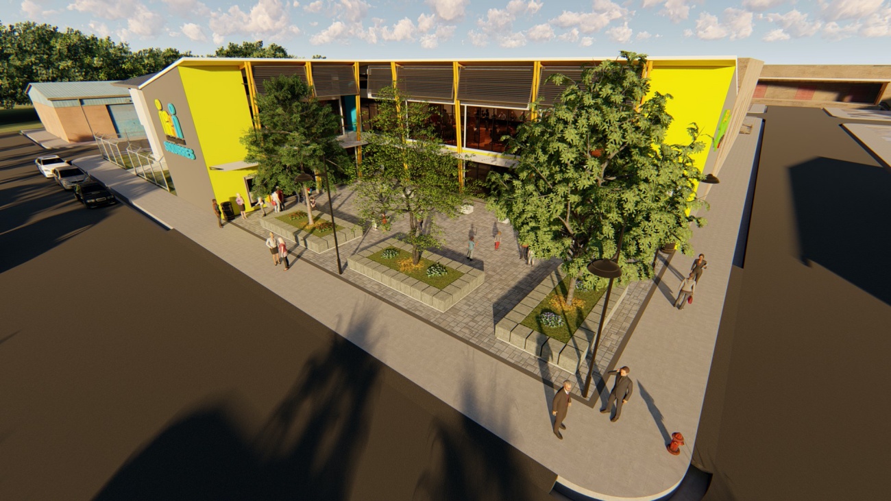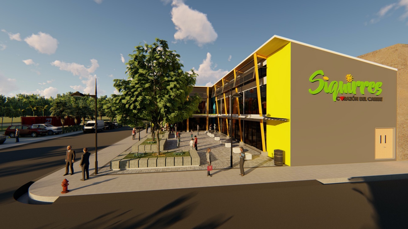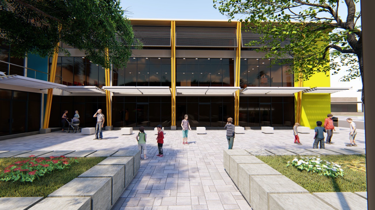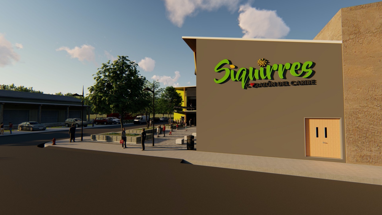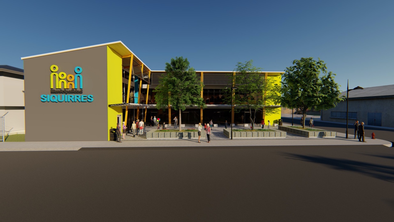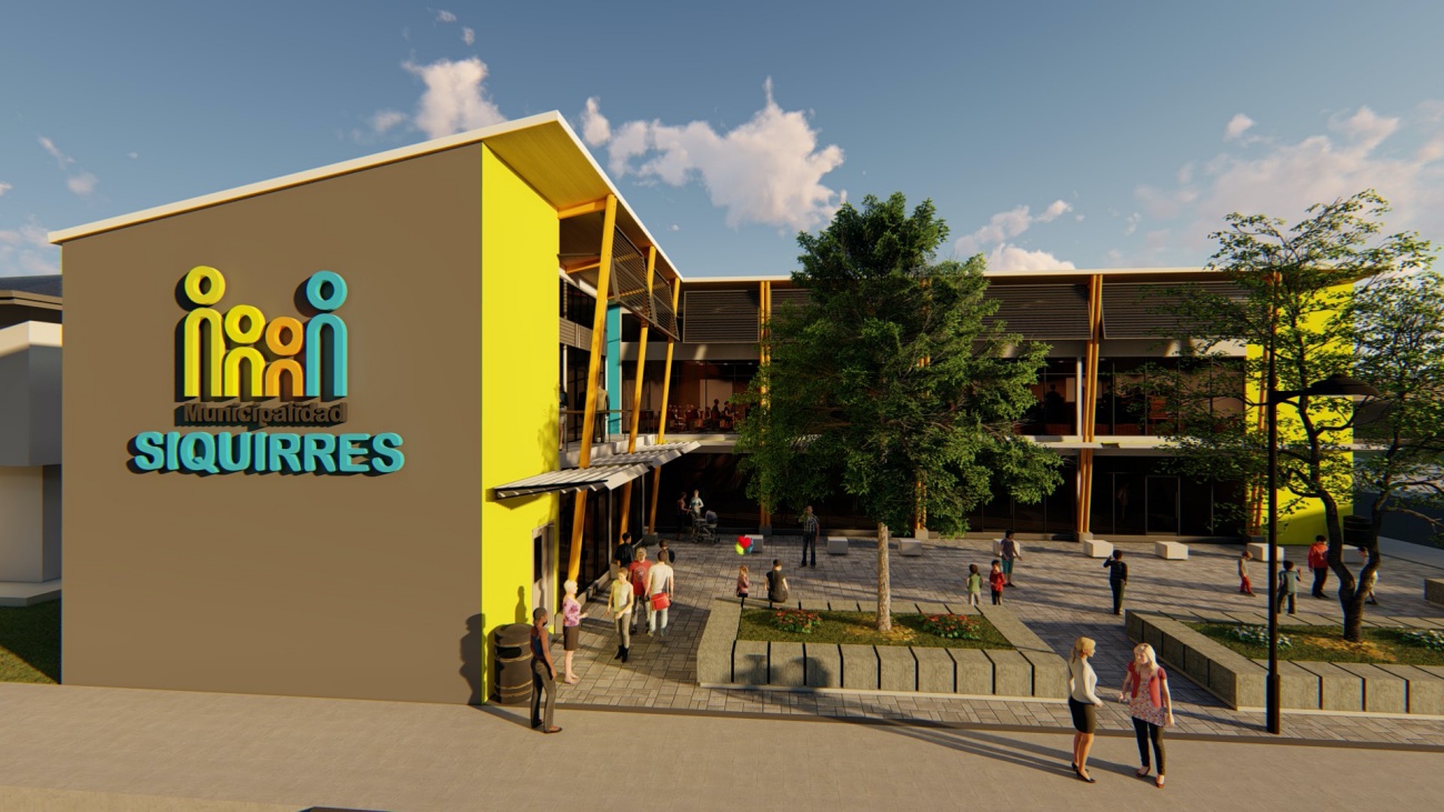 Edificio de 8 locales comerciales y sala del consejo municipal con batería de baños, elevador para cumplimiento de la ley 7600 y plaza pública para actividades exteriores.
