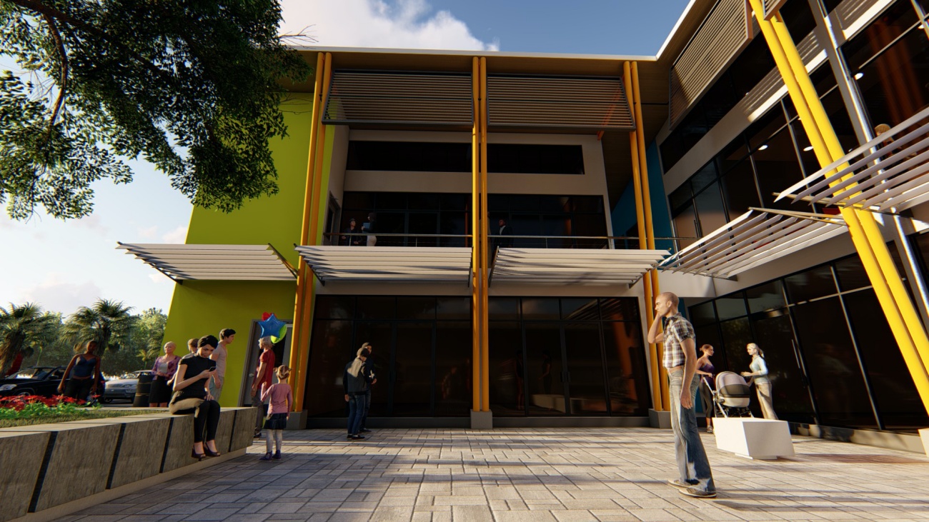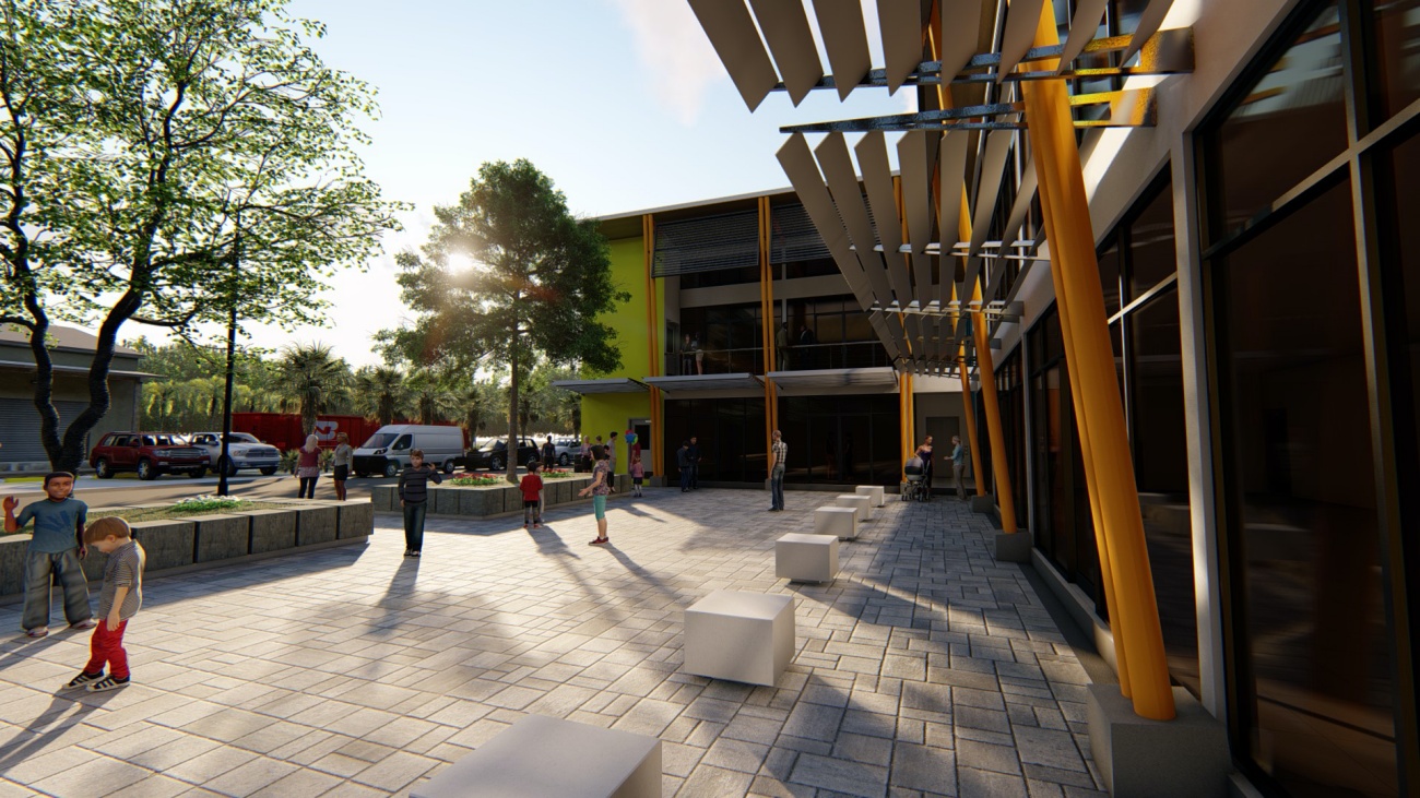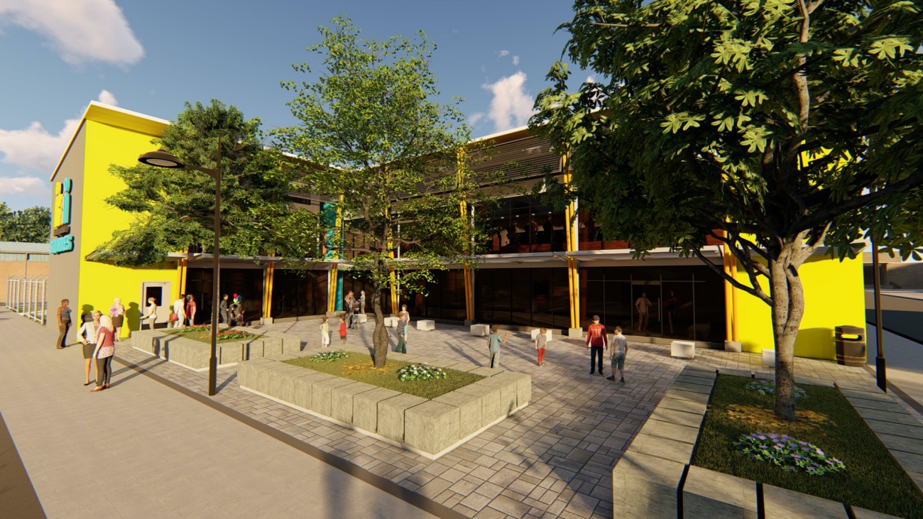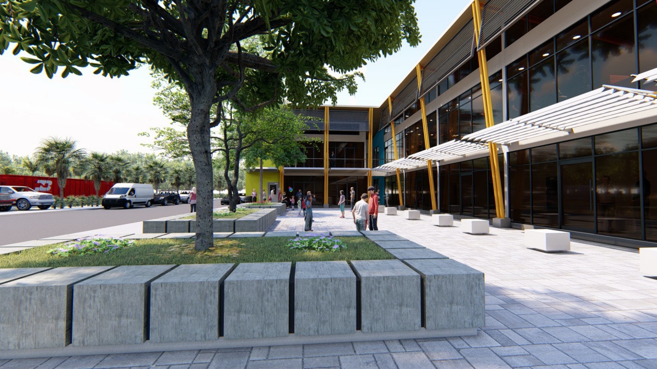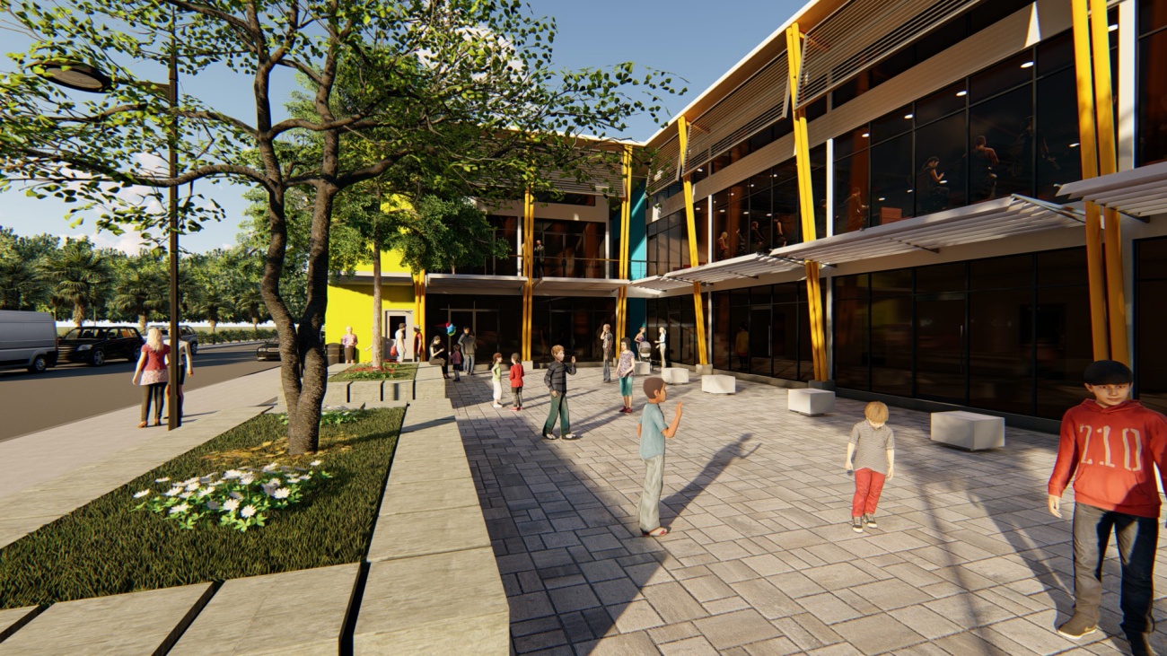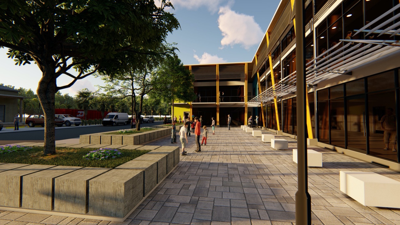 Edificio de 8 locales comerciales y sala del consejo municipal con batería de baños, elevador para cumplimiento de la ley 7600 y plaza pública para actividades exteriores.