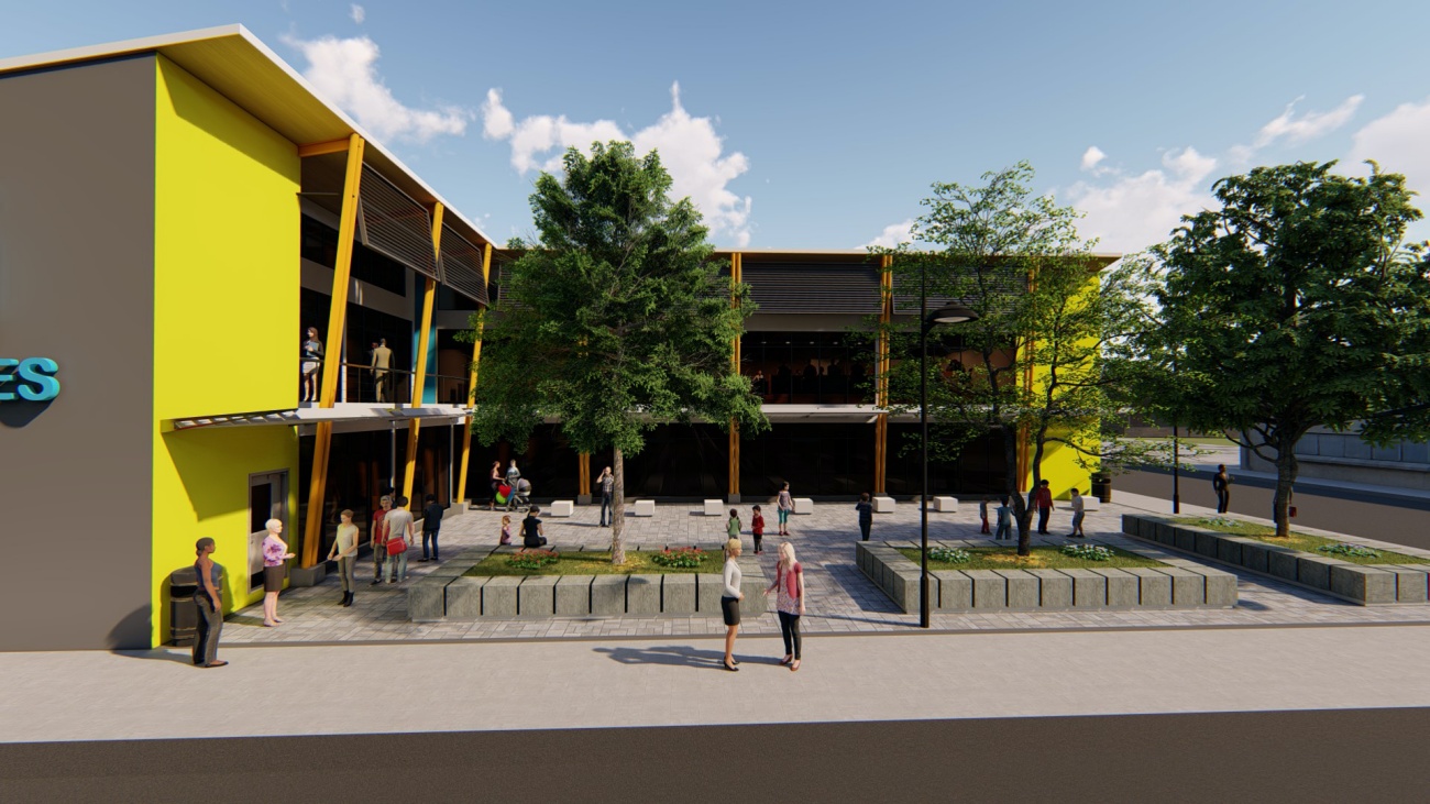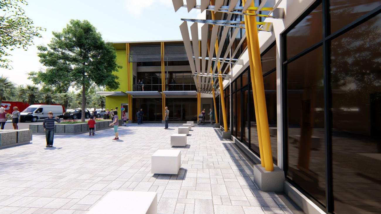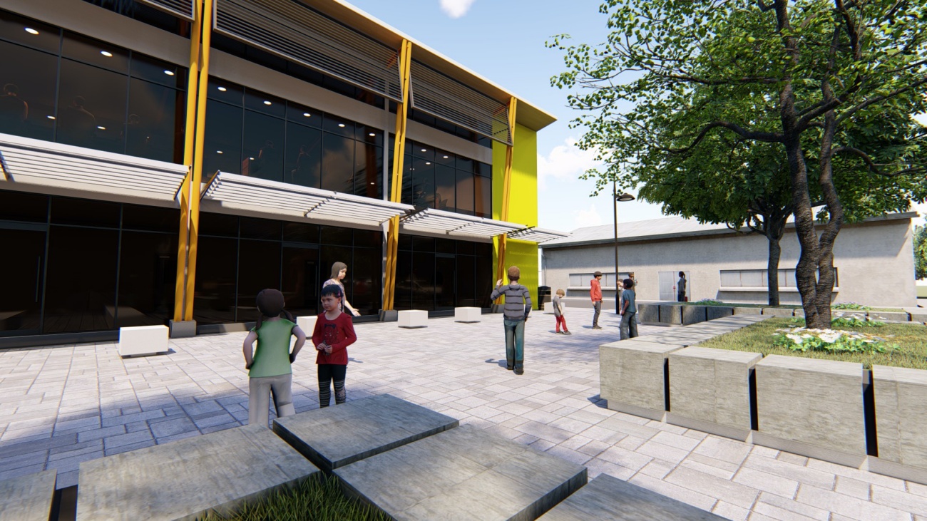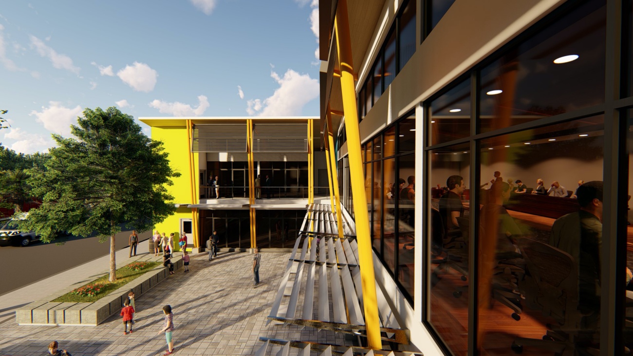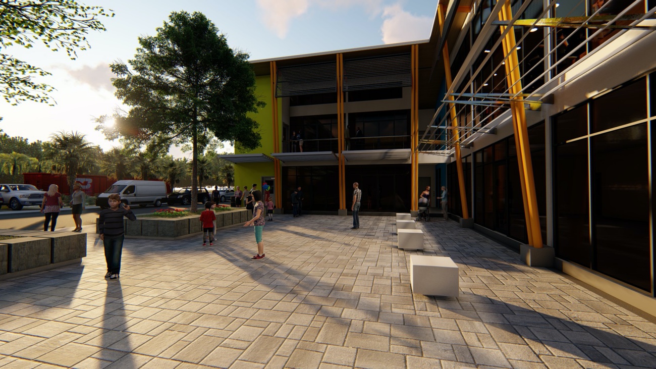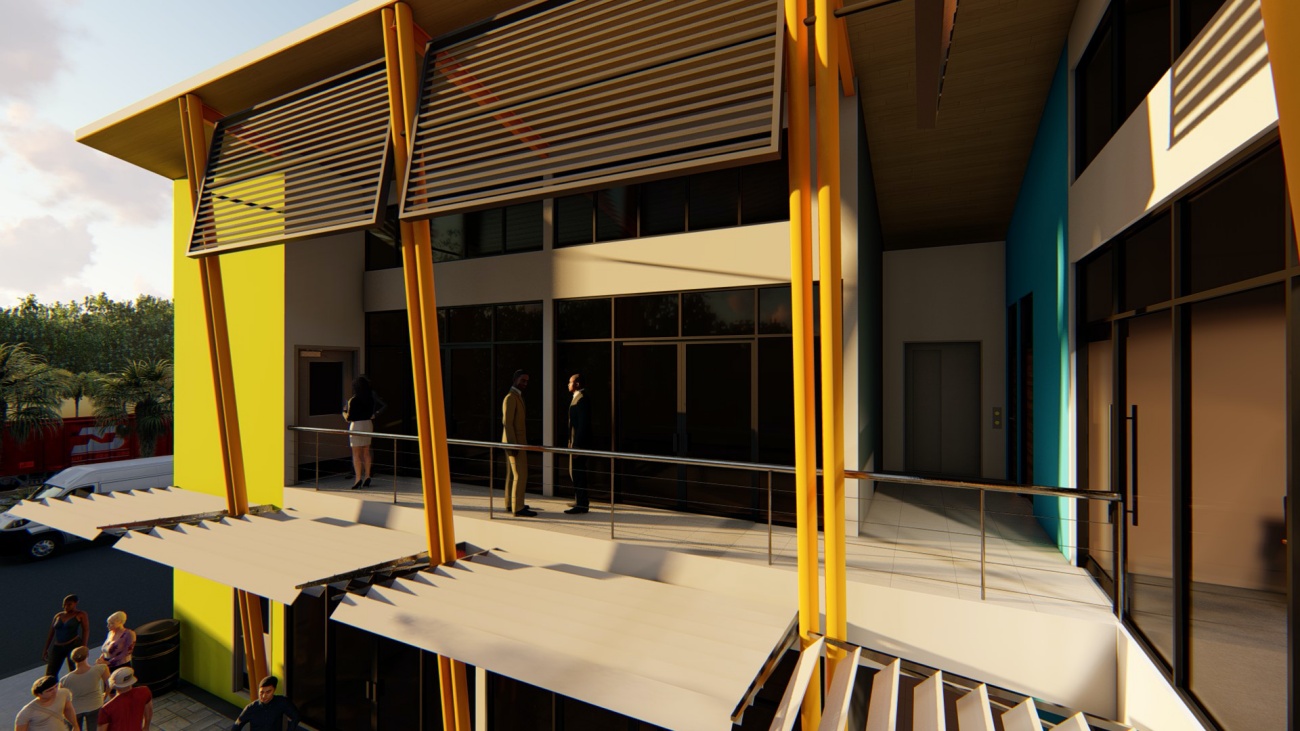 Edificio de 8 locales comerciales y sala del consejo municipal con batería de baños, elevador para cumplimiento de la ley 7600 y plaza pública para actividades exteriores.