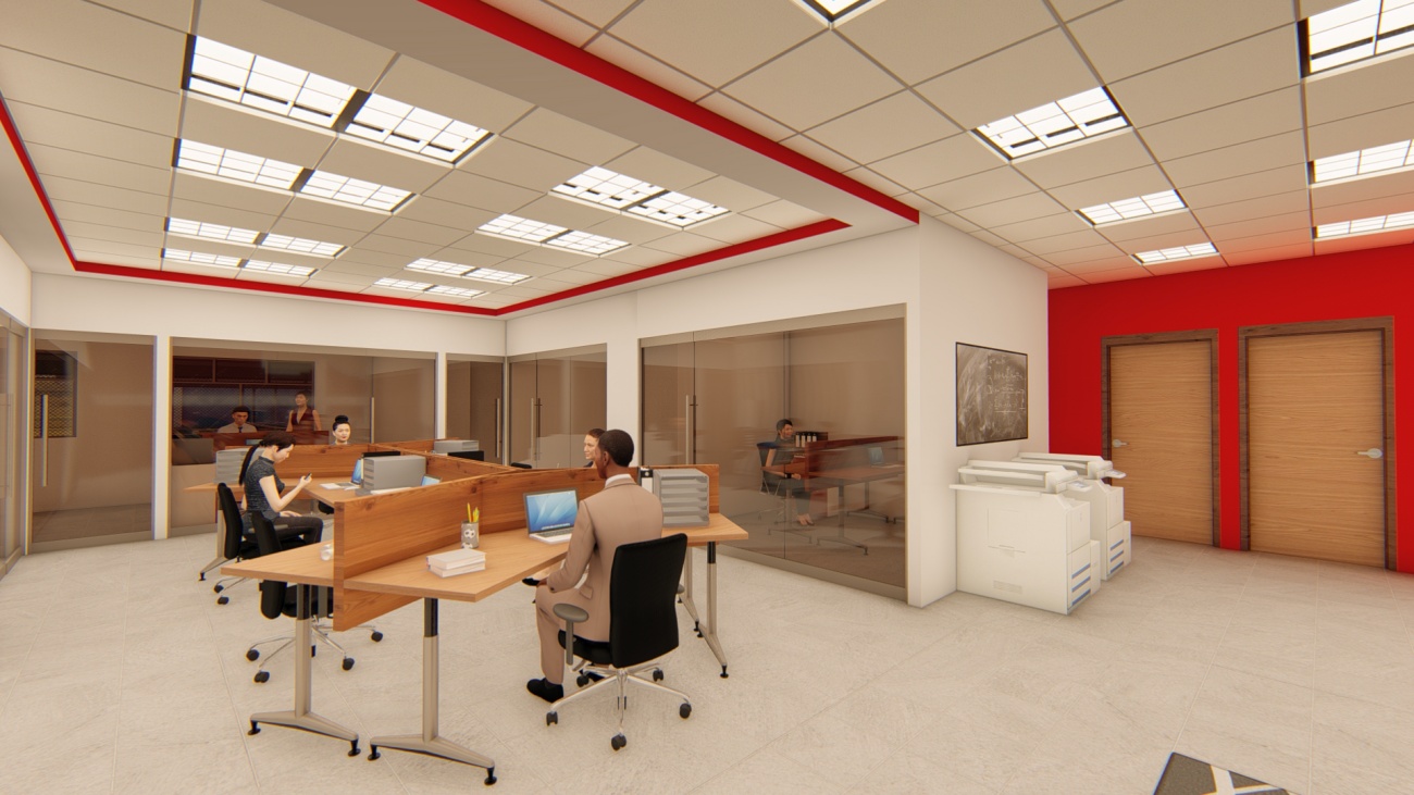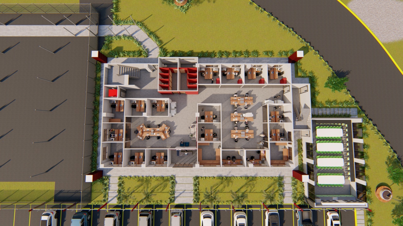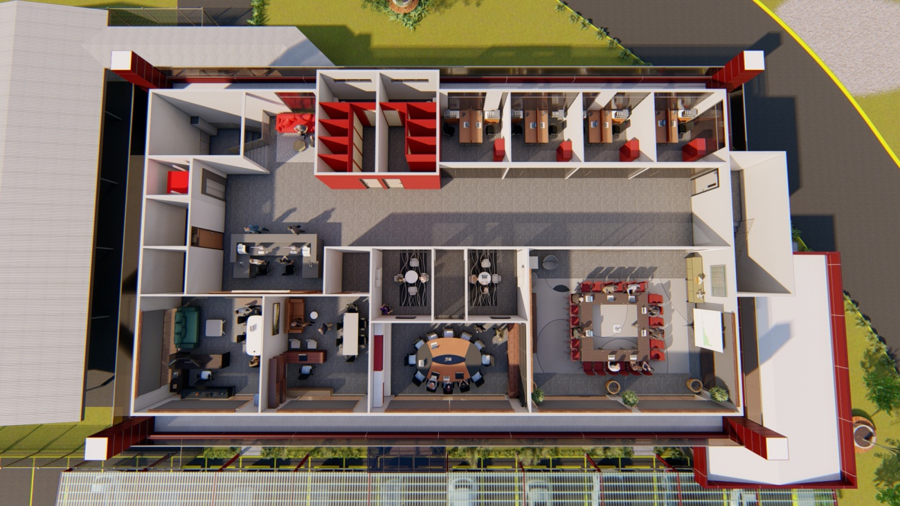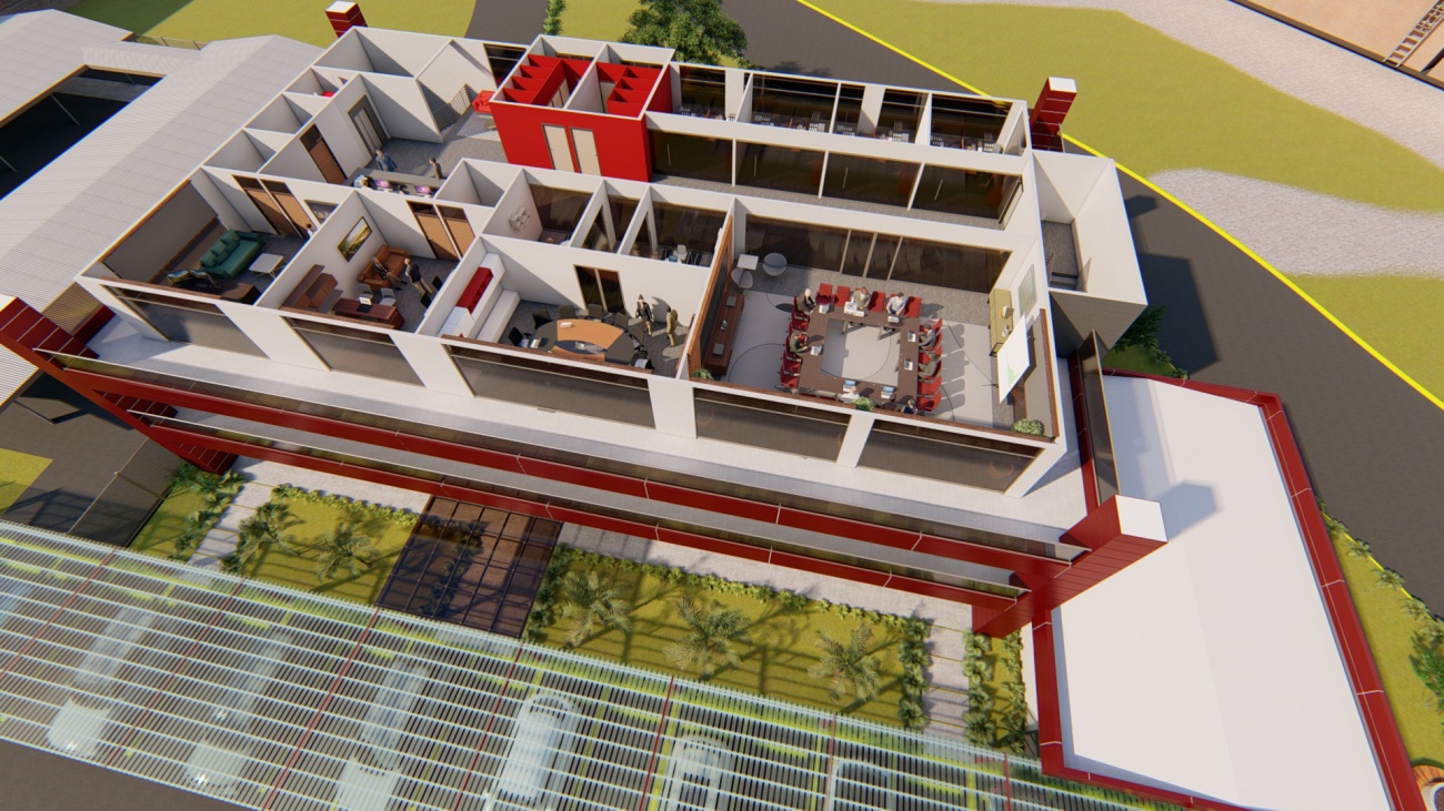 Edificio de oficinas para 120 personas distribuido en 3 niveles con espacios como cubículos, oficinas grupales, oficinas separadas, centros de reuniones y 1 sala magna para conferencias junto con 2 oficinas de gerencia y batería de baños en cada piso.